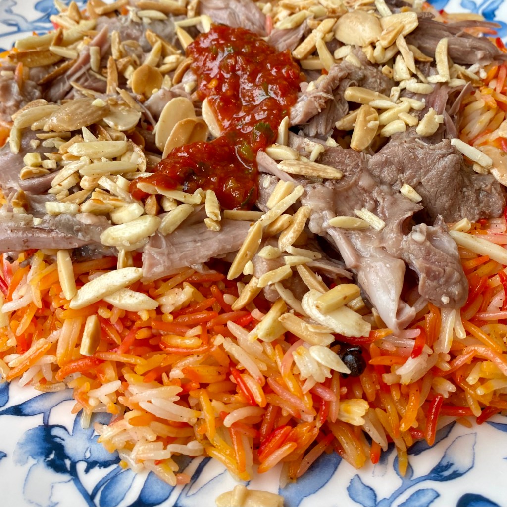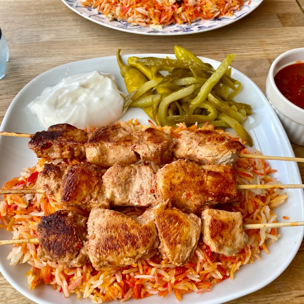 Firstly, the rice presented itself as a work of art. Stunningly colorful and a veritable kaleidoscope of flavors, sprinkled with crisp almonds and a bountiful serving of lamb. Accompanying it was a delectable, tangy, tomato-based sauce, beckoning me to pour it on the rice and meat. In theory, it should have been perfect. Visually, it was striking. Yet, Mandi and I didn’t get along – and for the life of me, I can’t figure out why. My eating buddy’s chicken kebab was extraordinary, and the falafel at the adjacent table appeared impeccable.