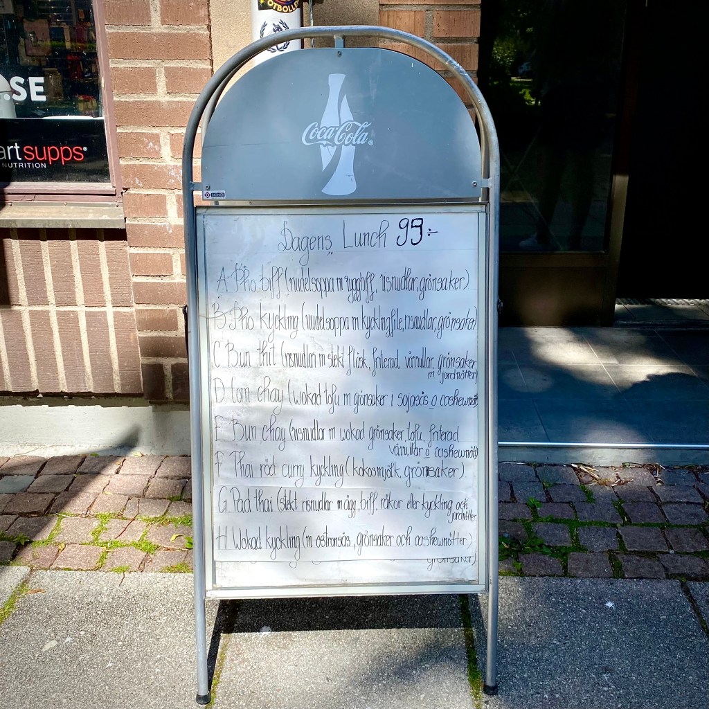The interior is loud, chaotic, and steaming. Every table is occupied, with most people hunched over their plates like watchful dogs. A few early birds have already finished their meal and sit back and laugh, chatting casually over a coffee. The vibrant, concentrated, collective feast we’re witnessing creates a distinct non-Swedish ambiance*, an impression intensified by the only available – in profound violation of even the most laid back fire code – “if there’s a will, there’s a way”-placed table in a narrow hallway just by the kitchen, where the woks, pots, and pans dance away on the burners. The cooks are red-faced and slick with sweat. Stacks of delicately balanced plates eagerly await to be filled with herbs, spices, nuts, sliced chicken, beef, or pork. The menu offers more than Phô, but we can’t see beyond that. We’re blinded by desire.